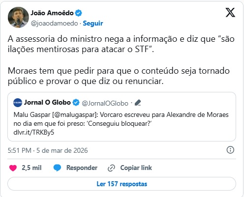 Em publicação nas redes sociais, Amoêdo reagiu à controvérsia envolvendo o caso e cobrou esclarecimentos diretos do ministro. “Moraes tem que pedir para que o conteúdo seja tornado público e provar o que diz ou renunciar.”, escreveu.
